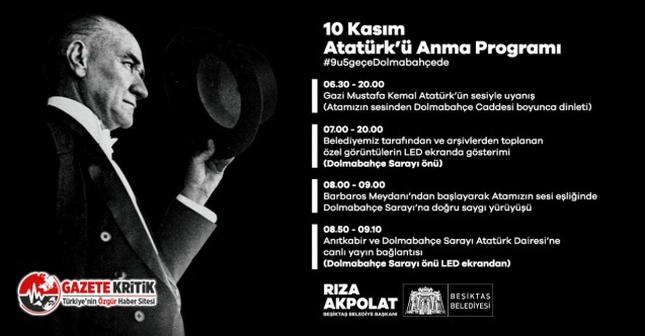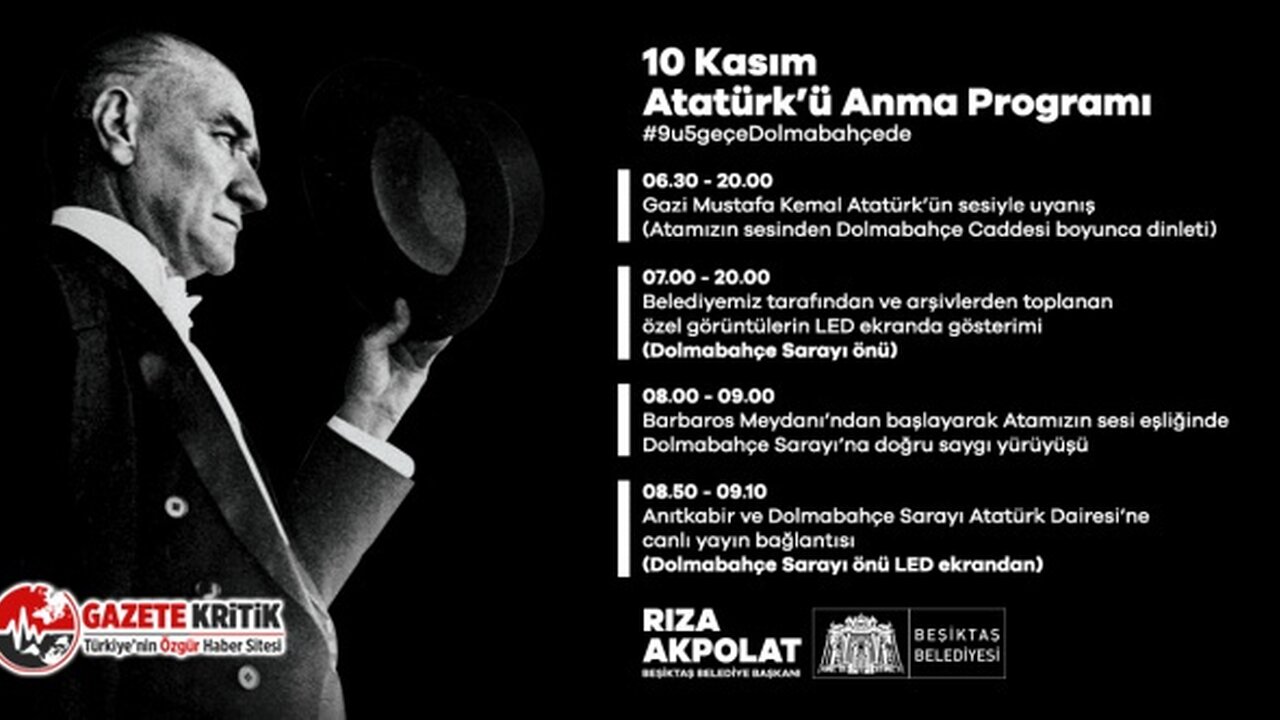 Saat 08.00’de Barbaros Meydanı’nda ATA’ya saygı yürüyüşü gerçekleştirilecek. Ata’mızın sesinden özel olarak hazırlanan dinleti eşliğinde vatandaşlar Beşiktaş Belediye Başkanı Rıza Akpolat ile birlikte Dolmabahçe Sarayı’na yürüyecek.