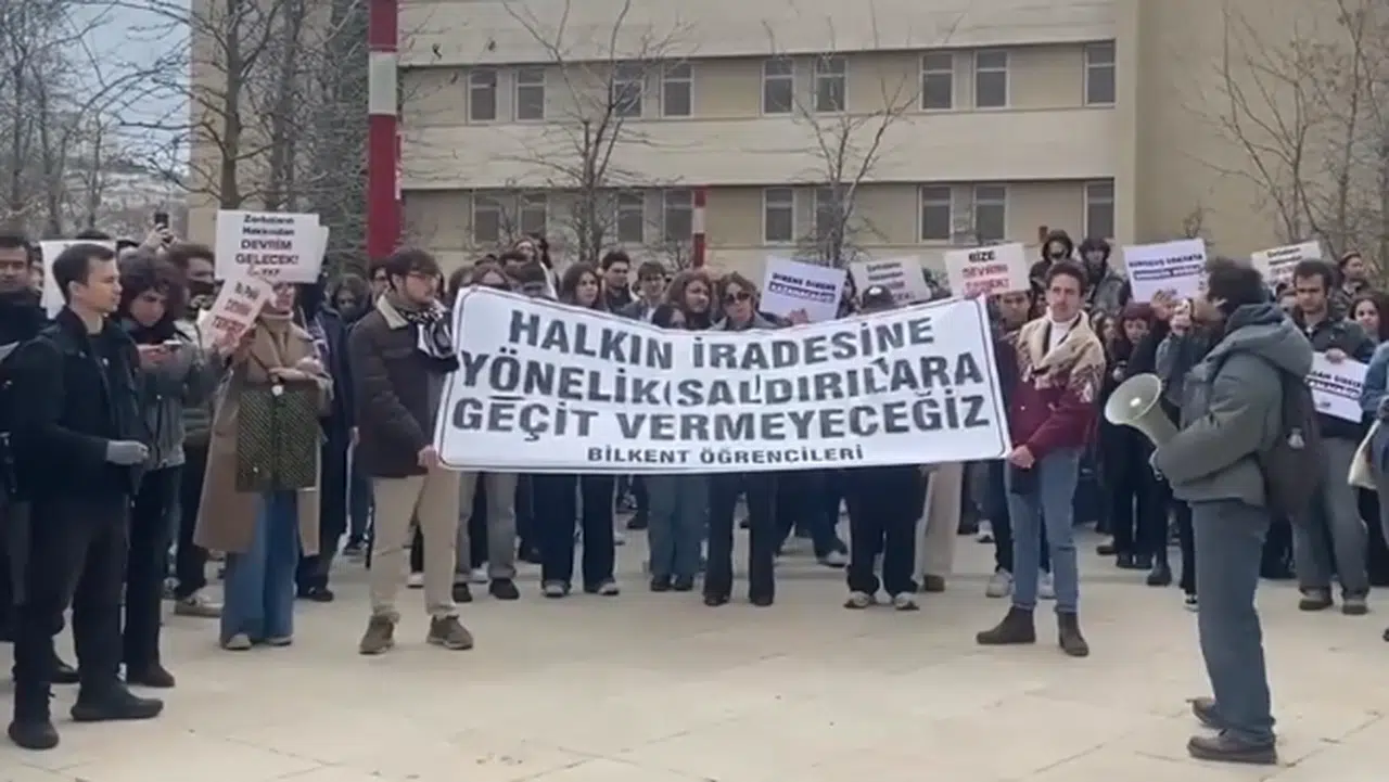 Üniversite öğrencilerinin İstanbul Büyükşehir Belediye Başkanı Başkanı Ekrem İmamoğlu’nun da aralarında bulunduğu gözaltılara tepkisi sürüyor. Rektörlük binası önünde bir araya gelen Bilkent Üniversitesi öğrencileri, ''Mücadelemizi sokaklarda büyütmeye devam edeceğiz. ODTÜ’deki bütün gaz bombalarına, polis işkencesine, barikatlara karşı direnen öğrenciler mücadelesini büyütmekte kararlı'' açıklamasını yaptı.