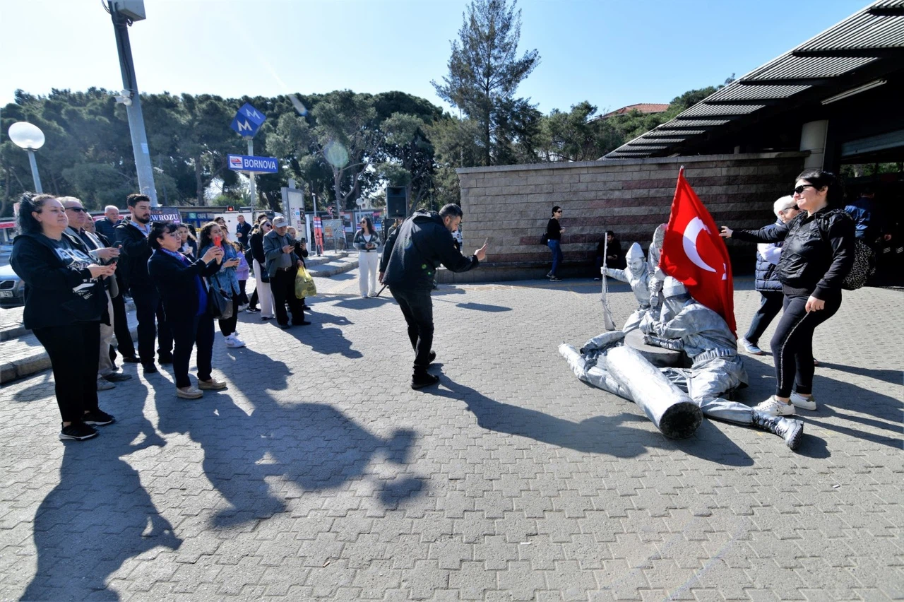 Bornova Metro İstasyonu çıkışında sahnelenen canlı heykel performansı, vatandaşlardan büyük ilgi gördü. Vatandaşlar Çanakkale Savaşı’ndan sahneleri canlandıran heykellerle hatıra fotoğrafları çektirdi.