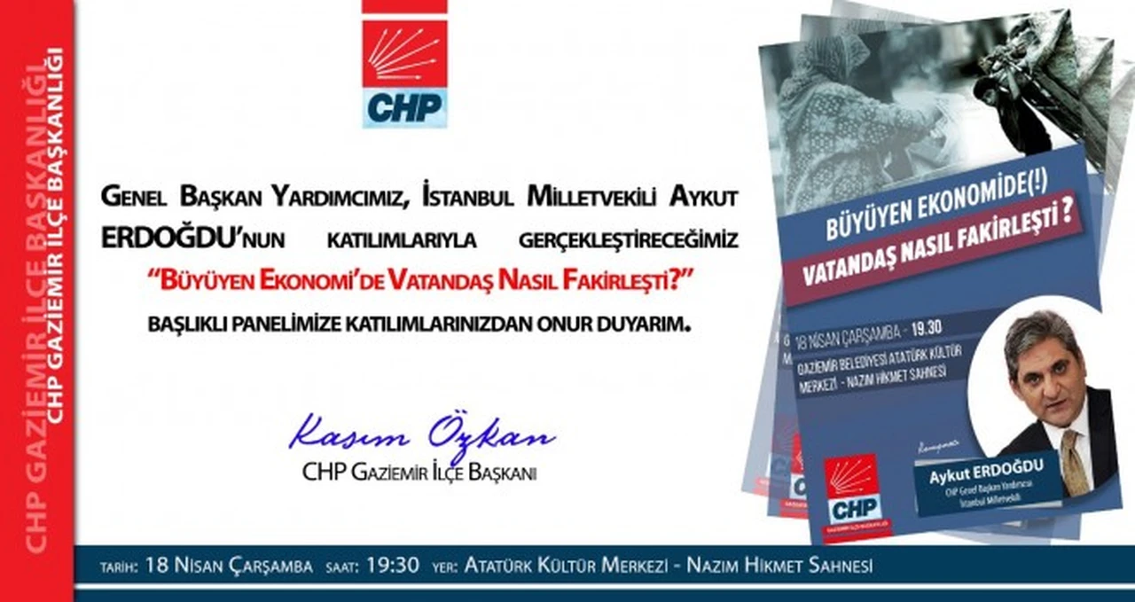 Cumhuriyet Halk Partisi Genel Başkan Yardımcımız Aykut ERDOĞDU'nun konuşmacısı olacağı "Büyüyen Ekonomide Vatandaş Nasık Fakirleşti" başlıklı Panel, 18 Nisan 2018 Çarşamba günü (Bugün) Saat 19.30'da, Gaziemir Atatürk Kültür Merkezi - Nazım Hikmet Sahnesinde gerçekeştirilecektir.