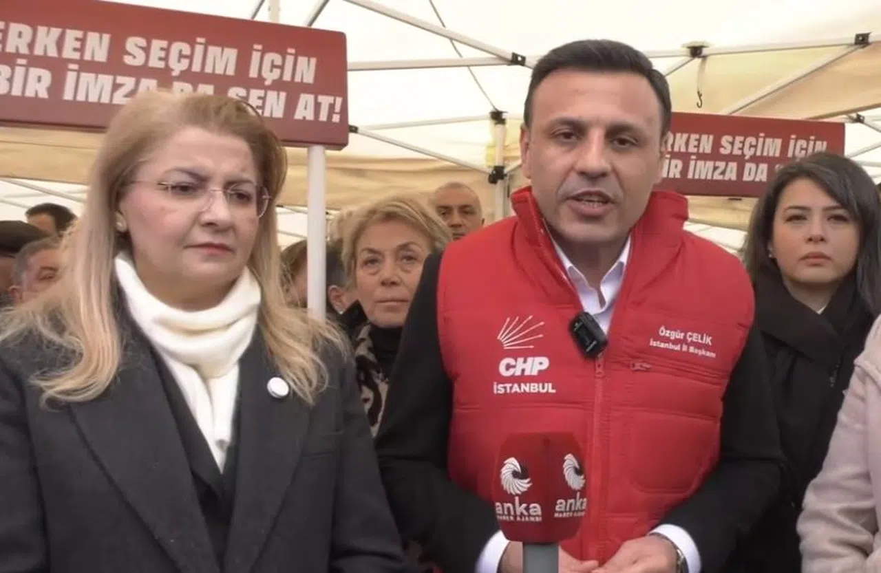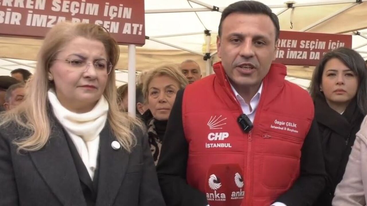 CHP İstanbul İl Başkanı Özgür Çelik, "İmza kampanyamızın birinci talebi Ekrem İmamoğlu'na özgürlük istiyoruz. İkinci talebimiz de erken seçim istiyoruz. Peki sadece Ekrem İmamoğlu'na mı özgürlük istiyoruz? Hayır. Bütün siyasi tutsaklara özgürlük istiyoruz. Öğrencilere de özgürlük istiyoruz. Kaldı ki bu mesele de sadece tek başına Ekrem İmamoğlu meselesi değil. Biz bir kişiye değil, İstanbul'un üç kere kazanmış Belediye Başkanı'na ve İstanbul halkının iradesine sahip çıkıyoruz'' dedi.