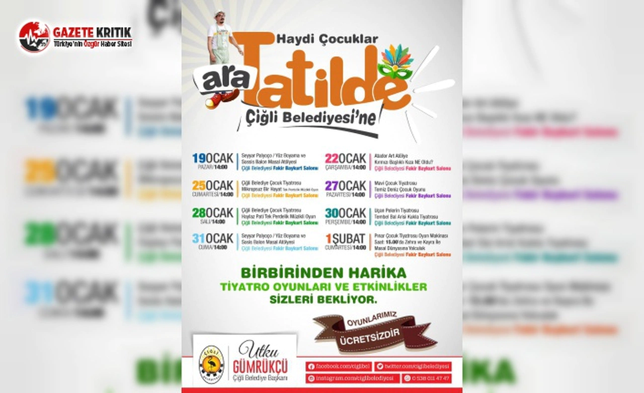 Kültür ve Sosyal İşler Müdürlüğü’nün organize edeceği etkinlikler Fakir Baykurt Salonu’nda gerçekleştirilecek. Etkinlikler kapsamında birbirinden değerli tiyatro gösterimleri ve eğlenceli oyunlar düzenlenecek. 8 gün boyunca sürecek olan program, 19 Ocak Pazar Günü saat 14:00’da “Seyyar Palyaço/ Yüz Boyama ve Sosis Balon Masal Atölyesi” etkinliğiyle başlayacak. Etkinliğe katılan öğrencilere çeşitli hediyeler verilecek. Tatil boyunca yapılacak etkinlikler ise şöyle: Belediye tiyatrosundan “Mikropsuz Bir Hayat”, Atador Art Atölye’den “Kırmızı Başlıklı Kıza Ne Oldu?”, Mavi Çocuk Tiyatrosu’ndan “Temiz Deniz Çocuk Oyunu”, Uçan Pelerin Tiyatrosu’ndan “Tembel Bal Arısı Kukla Tiyatrosu” ve Pınar Çocuk Tiyatrosu’ndan “Zehra ve Kayra ile Masal Dünyası”na yolculuk.