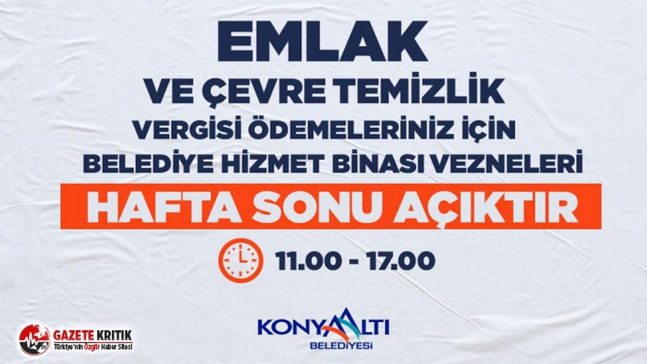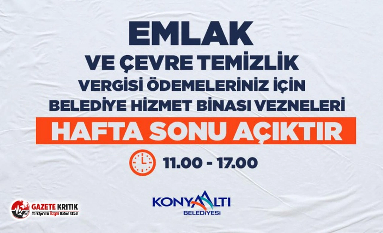Emlak ve Çevre Temizlik Vergisi’ni son günlere bırakan mükellefler için Konyaaltı Belediyesi'nin tahsilat vezneleri hafta sonu da açık olacak. Emlak ve Çevre Temizlik Vergisi 2’nci taksit ödemesi 30 Kasım Pazartesi günü mesai bitimine kadar yapılabilecek. Konyaaltı Belediyesi vergi borcunu ödemek için son güne kalan vatandaşların mağdur olmaması için 28 Kasım Cumartesi ve 29 Kasım Pazar günleri, veznedarların görev başında olacağını duyurdu.