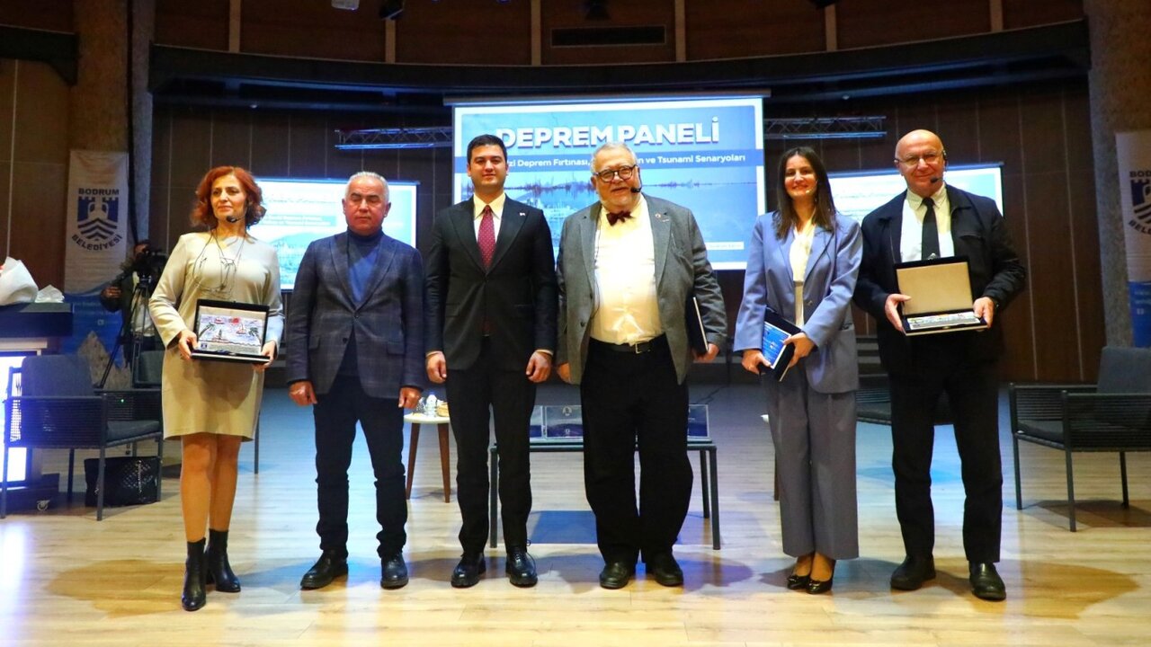 Uluslararası Tsunami Uzmanı Prof. Dr. Ahmet Cevdet Yalçıner, “Ocak- Şubat 2025 Ege Denizi Deprem Fırtınası ve Olası Tsunami Senaryoları” konulu sunumunu gerçekleştirirken İnşaat Yüksek Mühendisi Tarık Eray Çakır, 1956 Güney Ege tsunamisinin Bodrum Yarımadası’ndaki etkileri üzerine tanık anlatımlarından elde edilen bilgileri paylaştı.