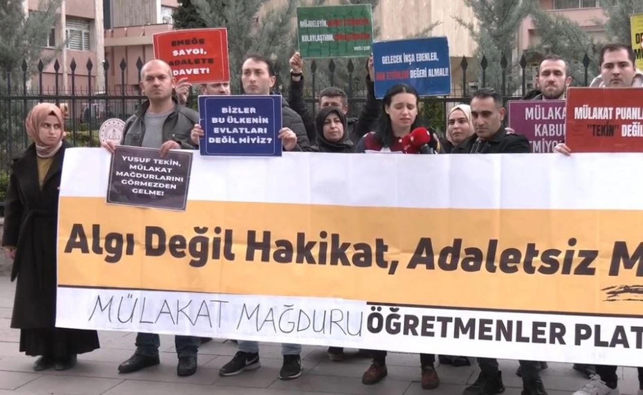 "Mülakat mağduru" öğretmen adayları, Milli Eğitim Bakanlığı (MEB) önünde açıklama yaptı. Grup adına konuşan Sevgi Süle, "Bin 611 öğretmenin emeğiyle elde ettiği başarıyı skandal bir mülakatla yok edenler, sürecin başından beri bizi davaya yönlendirip bu adaletsizliğin davalarla kısa sürede çözüleceğini söyledi. Ancak 155 gündür ne ortada böyle bir gerçek ne de böyle bir mahkeme kararı var. Sormak istiyoruz: Yüreği yanan insanlara yeniden hayal kırıklığı yaşatmak zulüm değil de nedir" diye konuştu.