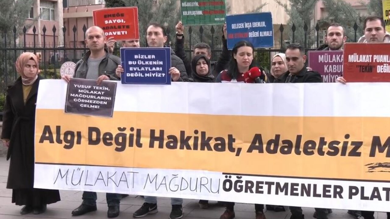 Öğretmen adayları, "Algı değil hakikat, adaletsiz mülakat" pankartı açıp, "Adalet dediniz kul hakkına girdiniz", "Mülakatçı bakan Yusuf Tekin istifa" sloganı attılar.