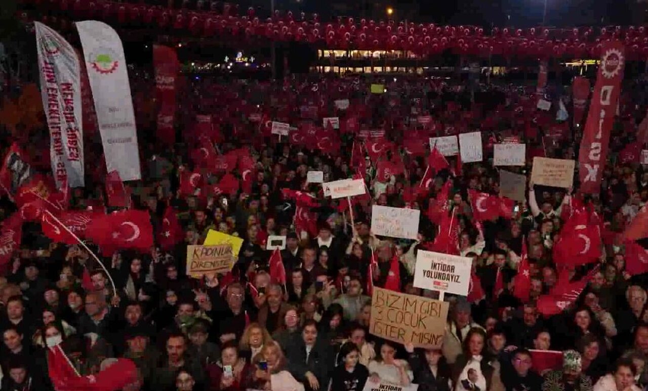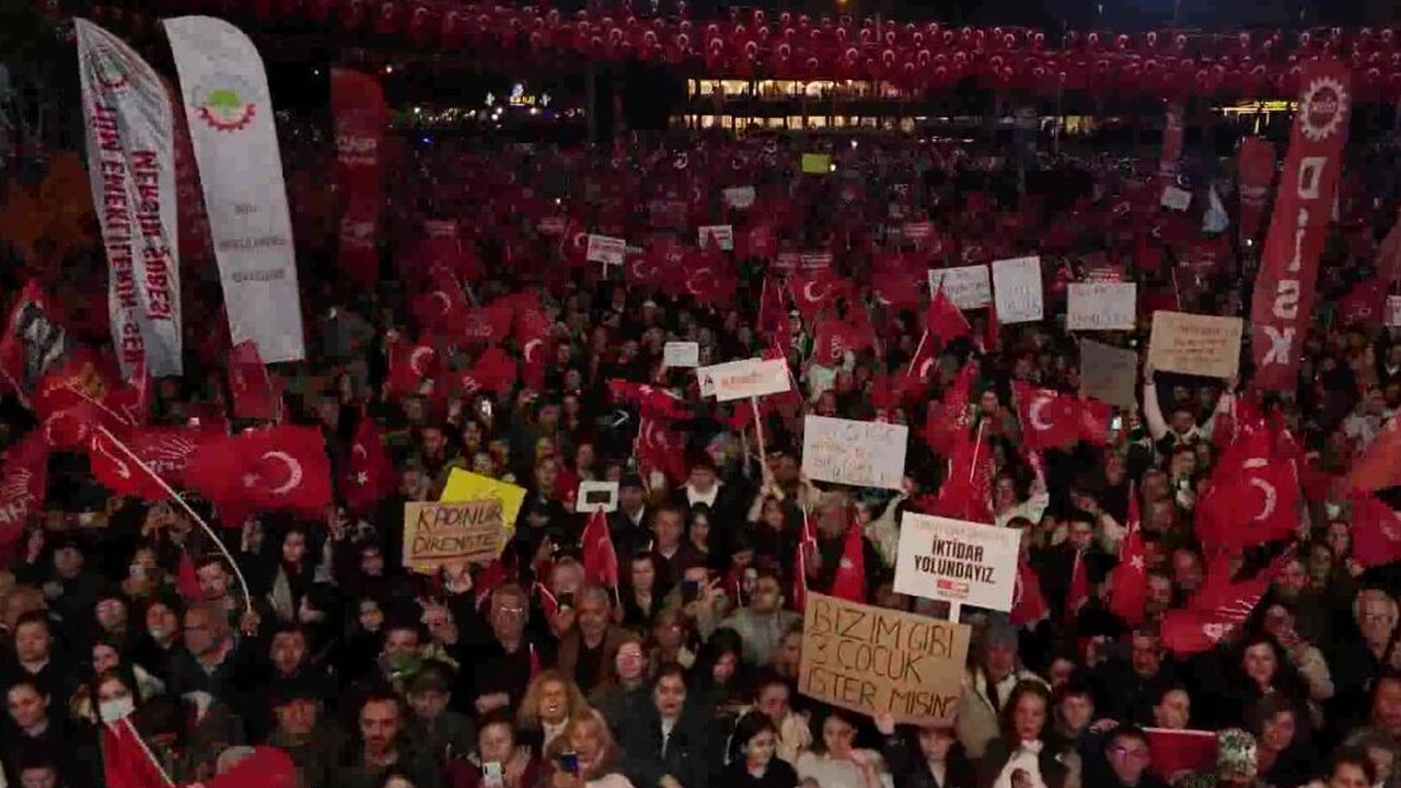 Kentin dört bir yanından gelen yurttaşların alanı doldurduğu dayanışma mitinginde coşkulu kalabalık ellerinde, “Karanlık ne kadar derinse şafak o kadar yakındır” , “Hak, hukuk, adalet”, “Gücünüz yetmez çünkü biz milletiz” , “Kurtuluş yok tek başına hep beraber ya hiçbirimiz”, “CHP başaracak milletin hakkı milletin olacak” , “19 Mart darbesine teslim olmayacağız” yazılı dövizler taşıdı.