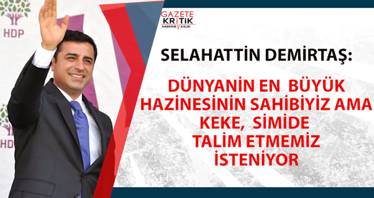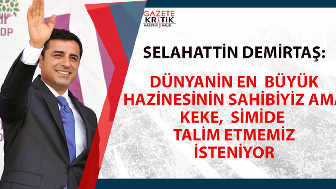 Türkiye'nin dünyanın en zengin topraklarına sahip olduğunu kaydeden Demirtaş, "Buna rağmen dünyanın en yoksulları arasındayız. Bunda bir tuhaflık yok mu? Dünyanın en büyük hazinesinin sahibiyiz ama keke, simide talim etmemiz isteniyor. Bu saçmalığa dur demeyelim mi?" diye sordu.
