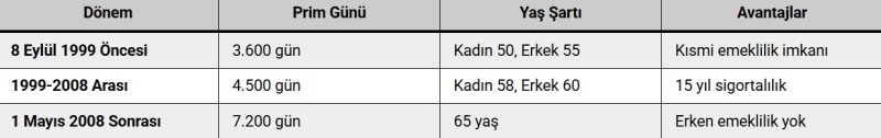 SGK’nın yayınladığı yeni tablo, sigortalılık başlangıç tarihine göre üç farklı sistemi kapsıyor: