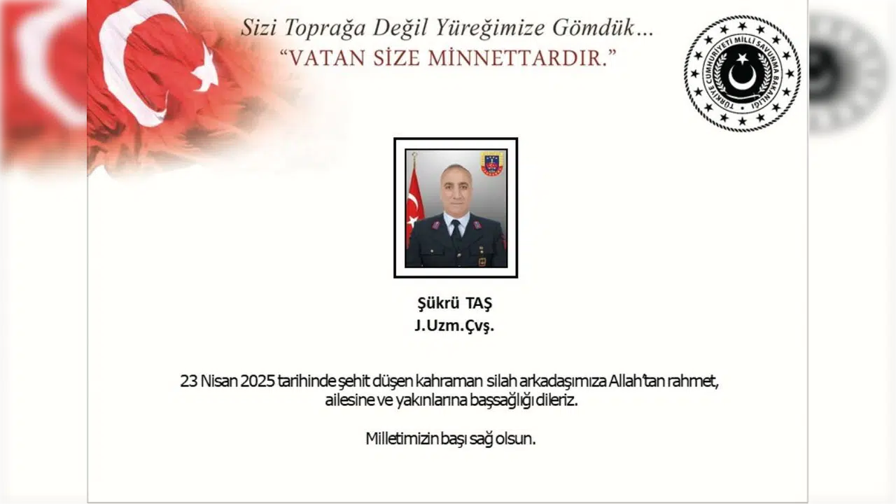 Milli Savunma Bakanlığı'nın, resmi sosyal medya hesabından paylaştığı taziye mesajında, "23 Nisan 2025 tarihinde şehit düşen kahraman silah arkadaşımıza Allah'tan rahmet, ailesine ve yakınlarına başsağlığı dileriz. Milletimizin başı sağ olsun" ifadesi kullanıldı.