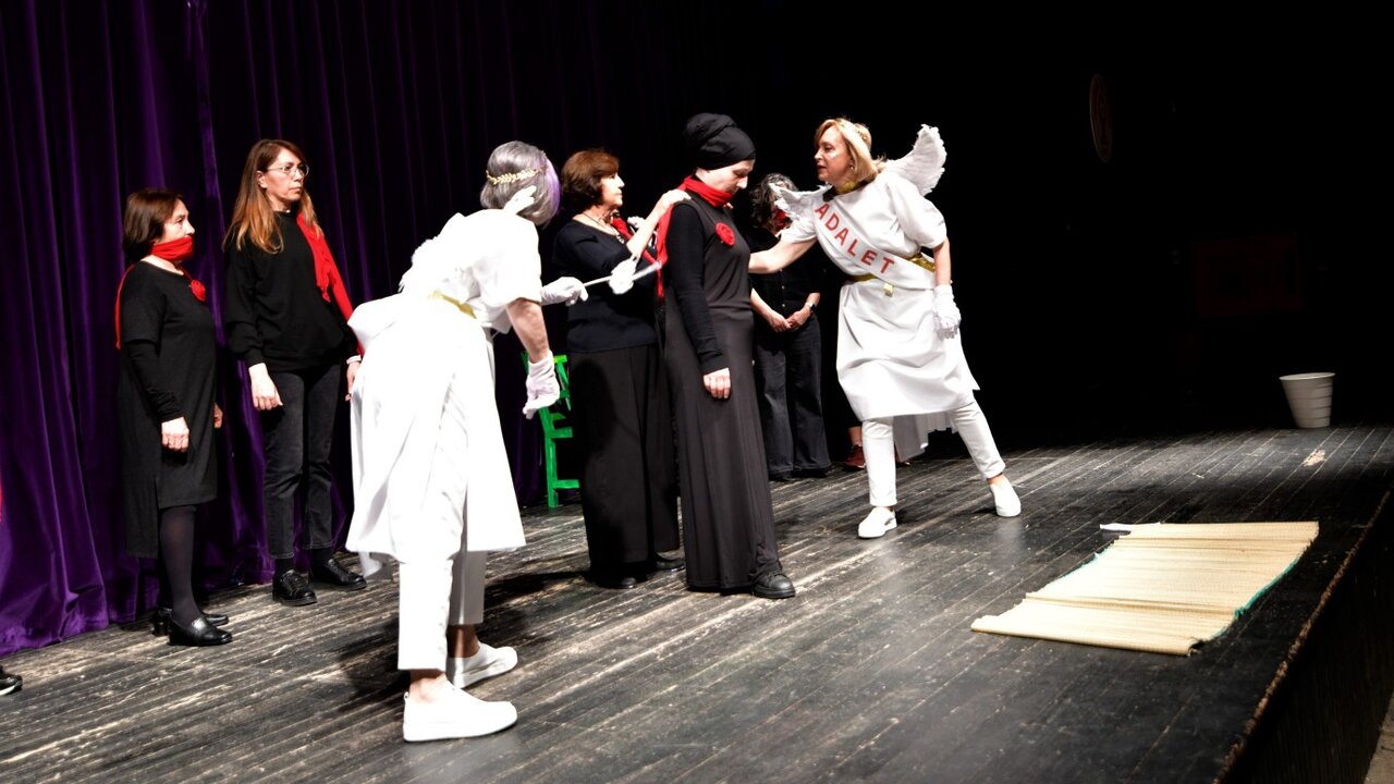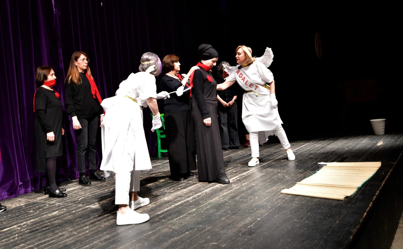 Özlem Sabuncuoğlu Kara’nın yönettiği oyun, kadınların iş hayatında, evde ve sosyal yaşamda karşılaştıkları psikolojik ve fiziksel şiddet ile çocuk istismarına karşı mücadelenin yollarını interaktif bir anlatımla ele aldı.