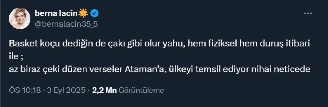 Maç sırasında A Milli Erkek Basketbol Takımı Koçu Ergin Ataman'ın kilolu haline yorum yapan Berna Laçin, sosyal medya üzerinden büyük bir tepki ile karşıladı.
