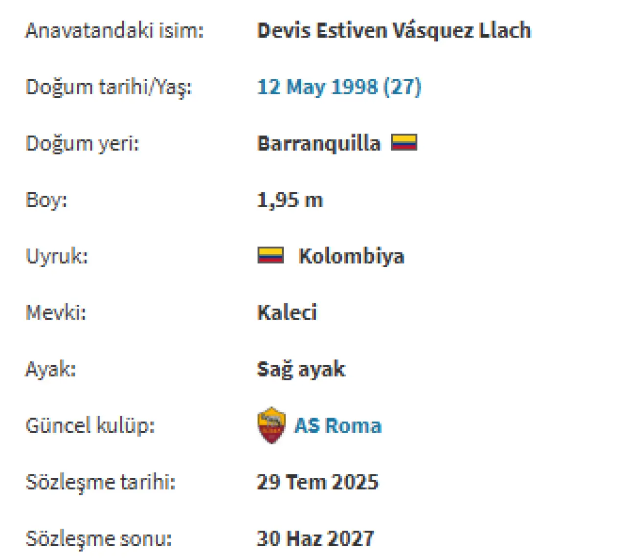 Devis Estiven Vásquez Llach, 12 Mayıs 1998 doğumlu Kolombiyalı profesyonel kaleci olarak biliniyor. Kariyerine Guaraní kulübünde başlayan Vasquez, Avrupa’da Sheffield Wednesday, Ascoli ve Empoli gibi takımlarda forma giydi. 2025 yazında Roma ile sözleşme imzalayan file bekçisi, 2025–2026 sezonunda Serie A’da forma şansı bulmasa da geniş kulüp tecrübesiyle dikkat çekiyor.