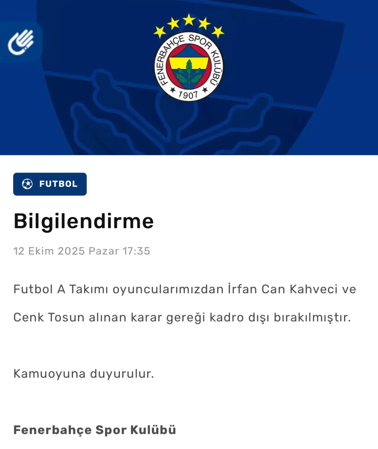 Fenerbahçe: Futbol A Takımı oyuncularımızdan İrfan Can Kahveci ve Cenk Tosun alınan karar gereği kadro dışı bırakılmıştır.