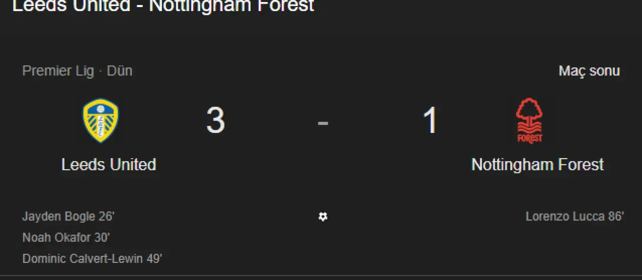 İngiltere Premier Lig’in 25. hafta maçında Nottingham Forest, Leeds United FC deplasmanında 3-1’lik skorla mağlup oldu. Forest’ın golünü Lorenzo Lucca atarken, Leeds United’da Jayden Bogle, Noah Okafor ve Dominic Calvert-Lewin sahneye çıkıp ev sahibini galibiyete taşıdı. Forest, bu sonuçla lig sıralamasında küme düşme hattının hemen üstünde kaldı ve sezonun geri kalanında puan kayıplarını telafi etme ihtiyacı doğdu.