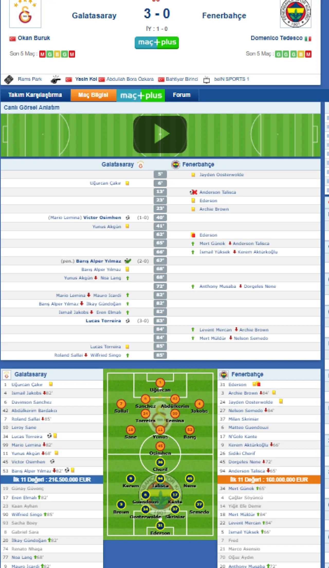 Karşılaşmanın ardından futbol kamuoyunun gündeminde tek bir sonuç var: Galatasaray 3, Fenerbahçe 0. Sarı-kırmızılı ekip, ezeli rakibi karşısında aldığı farklı galibiyetle derbi gecesini zaferle kapattı.