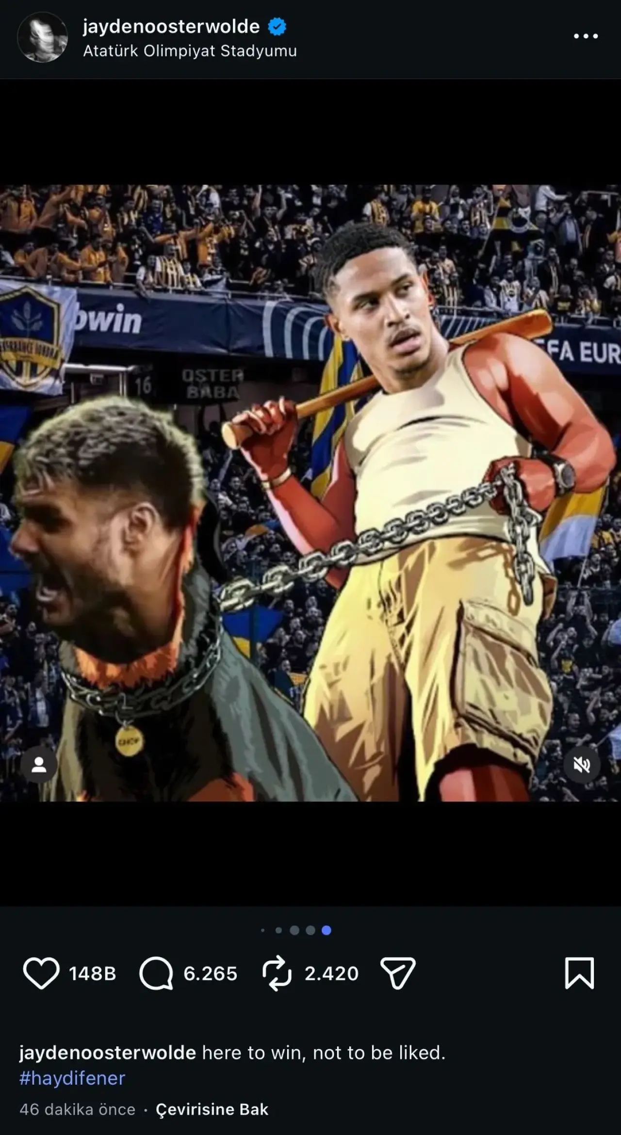 Hollandalı oyuncunun bu paylaşımına Fenerbahçeliler beğeni ve paylaşım yaparak destek olurken, Galatasaraylılar ise büyü tepki gösterdi.