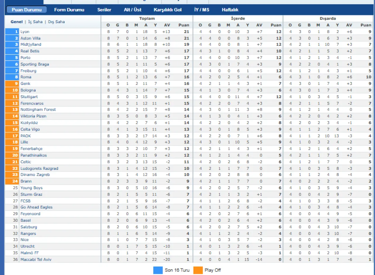 UEFA Avrupa Ligi 2025/26 sezonunun lig aşaması puan durumu sona erdi ve takımlar son sıralamalarını aldı. 36 takımlı lig formatında ilk 8 takım doğrudan son 16 turuna yükselirken, 9–24 arasındaki takımlar play-off turuna kalacak. Güncel sıralamada Lyon lider bitirirken Aston Villa, Midtjylland, Real Betis, Porto, Braga, Freiburg ve Roma ilk sekizdeki yerlerini garantiledi. Play-off potasında ise Genk, Bologna, Stuttgart, Ferencváros, Nottingham Forest, Viktoria Plzeň, Red Star Belgrad, Celta Vigo gibi ekipler yer alıyor. Fenerbahçe de bu grupta sıralamasını aldı ve play-off şansını sürdürüyor.