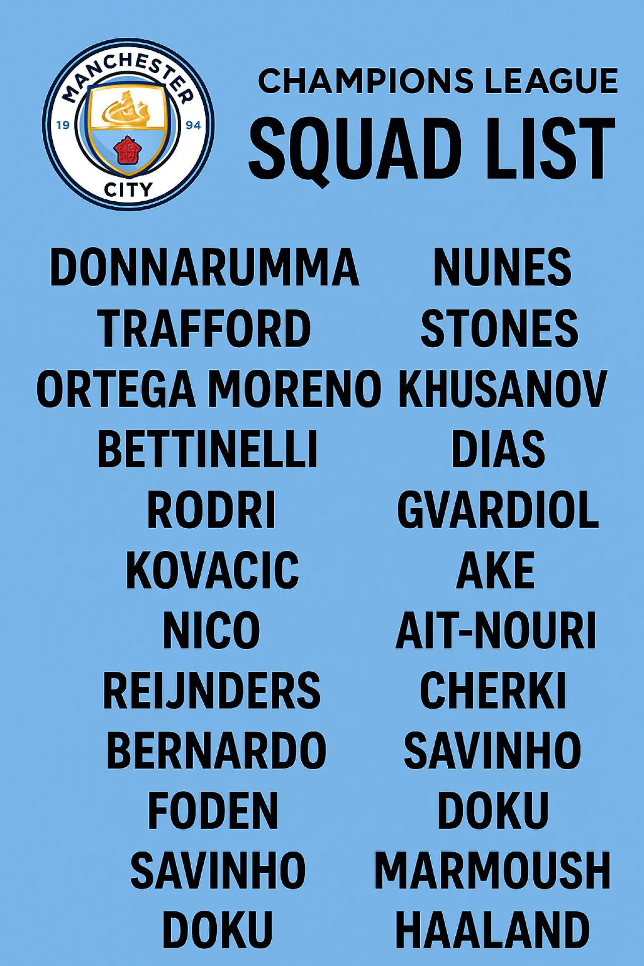 Manchester City, 2025-26 sezonu UEFA Şampiyonlar Ligi kadrosunu resmen duyurdu. Teknik direktör Pep Guardiola’nın seçtiği listede yıldız isimler dikkat çekerken, genç oyuncular da kadroda kendine yer buldu.