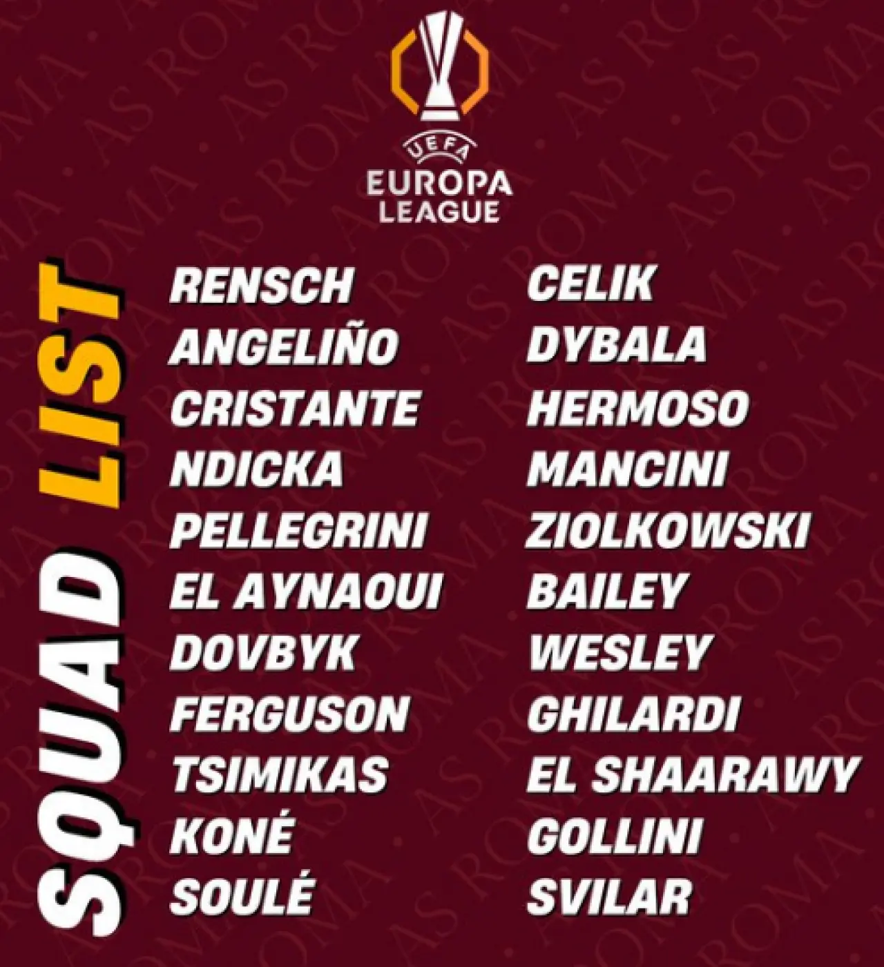 Teknik direktör Gian Piero Gasperini yönetimindeki yönetiminde açıklanan kadroda Lorenzo Pellegrini, Paulo Dybala, Bryan Cristante ve Stephan El Shaarawy gibi takımın kilit isimleri bulunuyor. Ayrıca yeni transferlerden Angelino, Dovbyk ve Kostantinos Tsimikas da listede yer aldı.