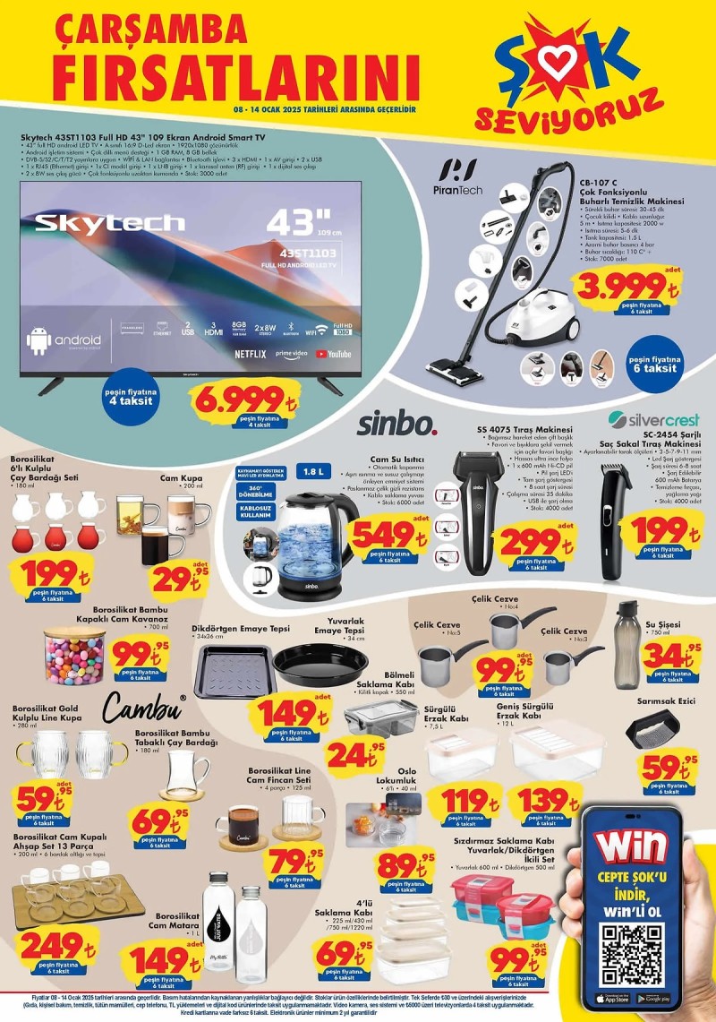 Bu hafta, Pirantech’in buharlı temizlik makinesinin yanı sıra birçok farklı kategoriden ürünler de ŞOK'ta yer alıyor. Bunlar arasında Skytech 43” Full HD Android Smart TV 6.999 TL, sinbo cam su ısıtıcı 549 TL, borosilikat cam fincan setleri, emaye tepsiler ve saklama kapları gibi ev gereçleri bulunuyor. Ayrıca, 6'lı çay bardağı seti 199 TL, 750 ml su şişesi 34,95 TL gibi fırsatlar da dikkat çekiyor.