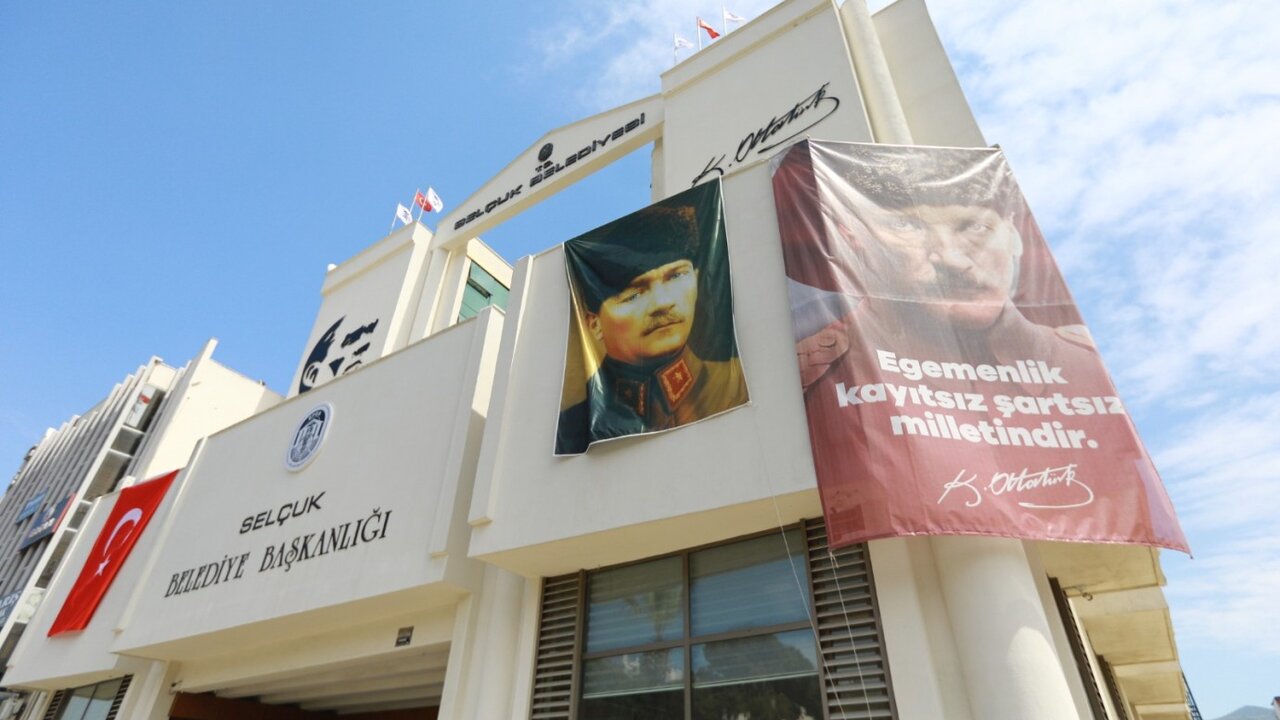Başkan Sengel’in Silivri Cezaevi’nden yaptığı açıklamanın sosyal medyada yayınlanmasının ardından belediye binası ve Efes Selçuk sokakları bayraklarla donatıldı.