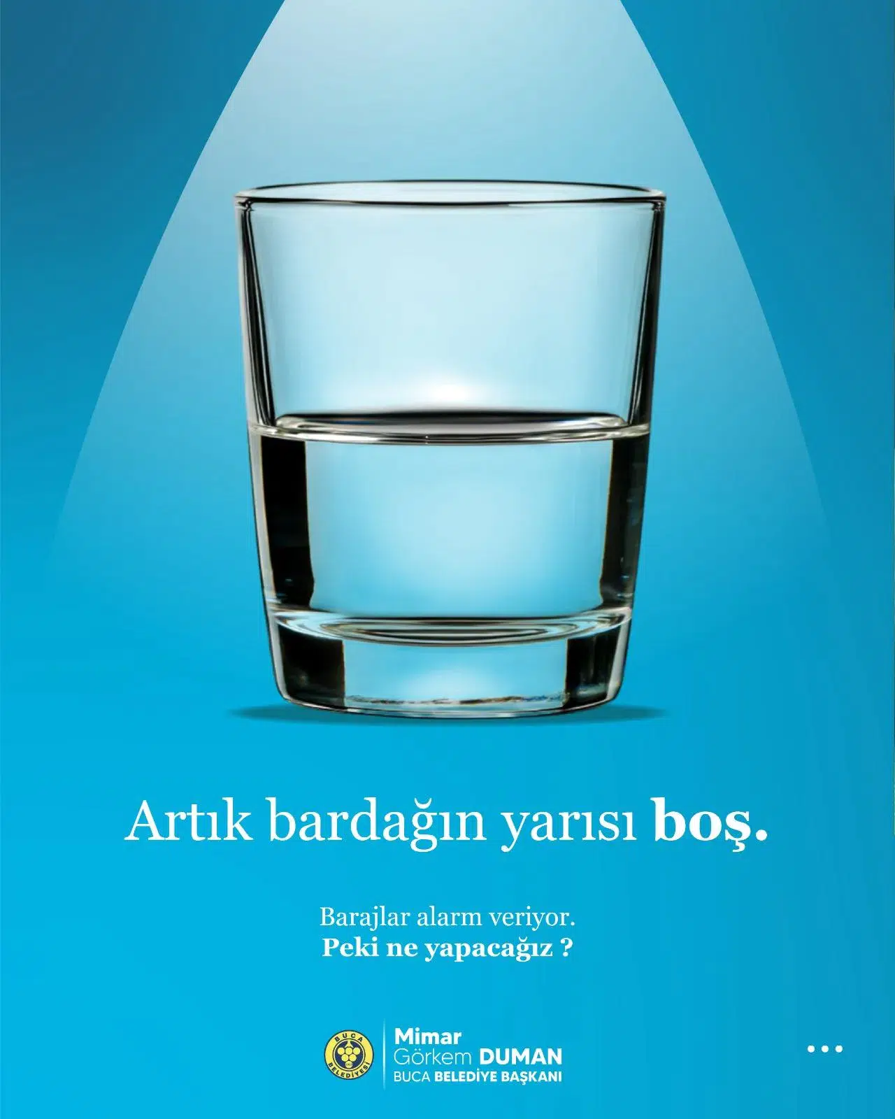 Buca Belediyesi, son elli iki yılın en kurak dönemini yaşadığımız şu günlerde “Artık Bardağın Yarısı Boş” sloganı ile su tasarrufu kampanyası başlattı. Kampanya, belediyenin sosyal medya hesapları üzerinden yapılan duyurularla vatandaşlara ulaştırılırken, Buca Belediye Başkanı Görkem Duman, tüm Buca halkını kampanyaya destek olmaya ve su kaynaklarını daha bilinçli kullanmaya davet etti.