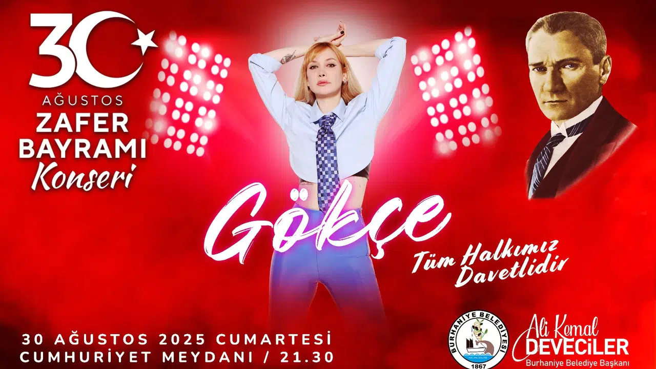 Zafer Bayramı kutlamaları kapsamında, 30 Ağustos Cumartesi günü Cumhuriyet Meydanı, bayram coşkusunun kalbi olacak. Ünlü müzisyen Gökçe, saat 21.30’da sahne alarak sevilen şarkılarıyla dinleyicileriyle buluşacak. Konser, Burhaniye Belediyesi tarafından ücretsiz olarak düzenlenecek.