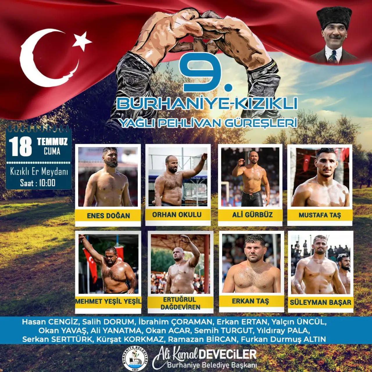 Bu yılki güreşler, Burhaniye Belediye Başkanı Ali Kemal Deveciler’in öncülüğünde gerçekleştirilecek. Organizasyona, Türkiye'nin tanınmış baş ve başaltı yağlı güreş pehlivanlarının yanı sıra çeşitli boylarda pek çok pehlivan katılacak. Güreş tutacak olan başpehlivanlar arasında Enes Doğan, Orhan Okulu, Ali Gürbüz, Mustafa Taş, Mehmet Yeşil Yeşil, Süleyman Başar, Ertuğrul Dağdeviren, Erkan Taş ve Hasan Cengiz gibi isimler öne çıkıyor. Bu isimlerin katılımı, güreş meraklıları için büyük bir heyecan kaynağı. Arenalardaki bu önemli mücadeleler, izleyicilere hem geçmişin mirasını yaşatma hem de sporun heyecanını yaşama fırsatı sunacak.