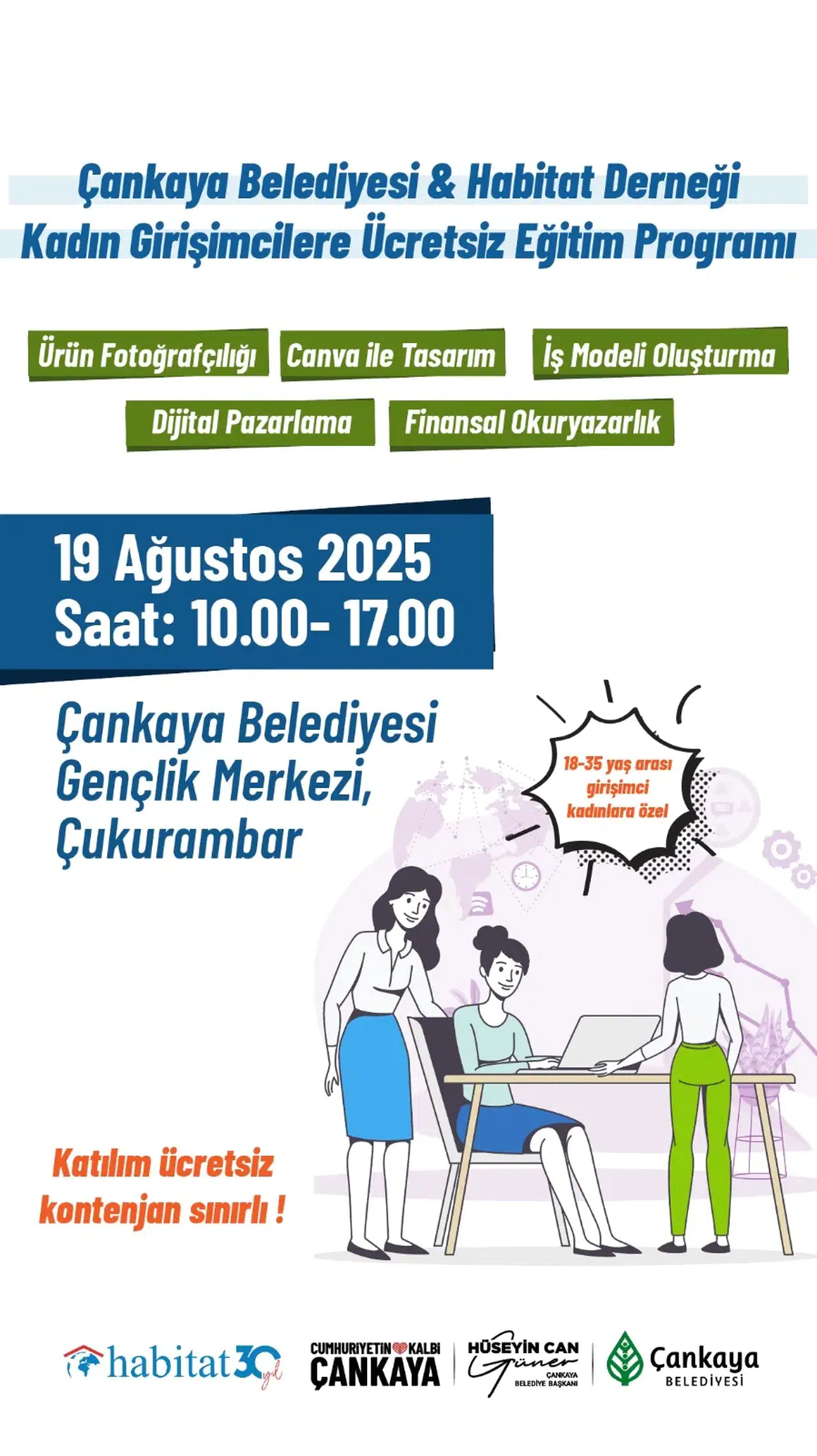 Türkiye’de kadın girişimciliğinin artırılmasını, sürdürülebilir kalkınmanın temel taşlarından biri olarak gören Çankaya Belediyesi, sivil toplum kuruluşları ile ortaklaşa düzenlediği eğitim, program ve projelerle örnek projelere imza atmaya devam ediyor. Çankaya Belediyesi, kadınların ekonomik hayata aktif katılımını artırmak ve girişimcilik potansiyellerini geliştirmek amacıyla Habitat Derneği işbirliğinde “Temel Girişimcilik” eğitimi düzenliyor. Eğitimlere 18-35 yaş arası kadın girişimciler katılabilecek.