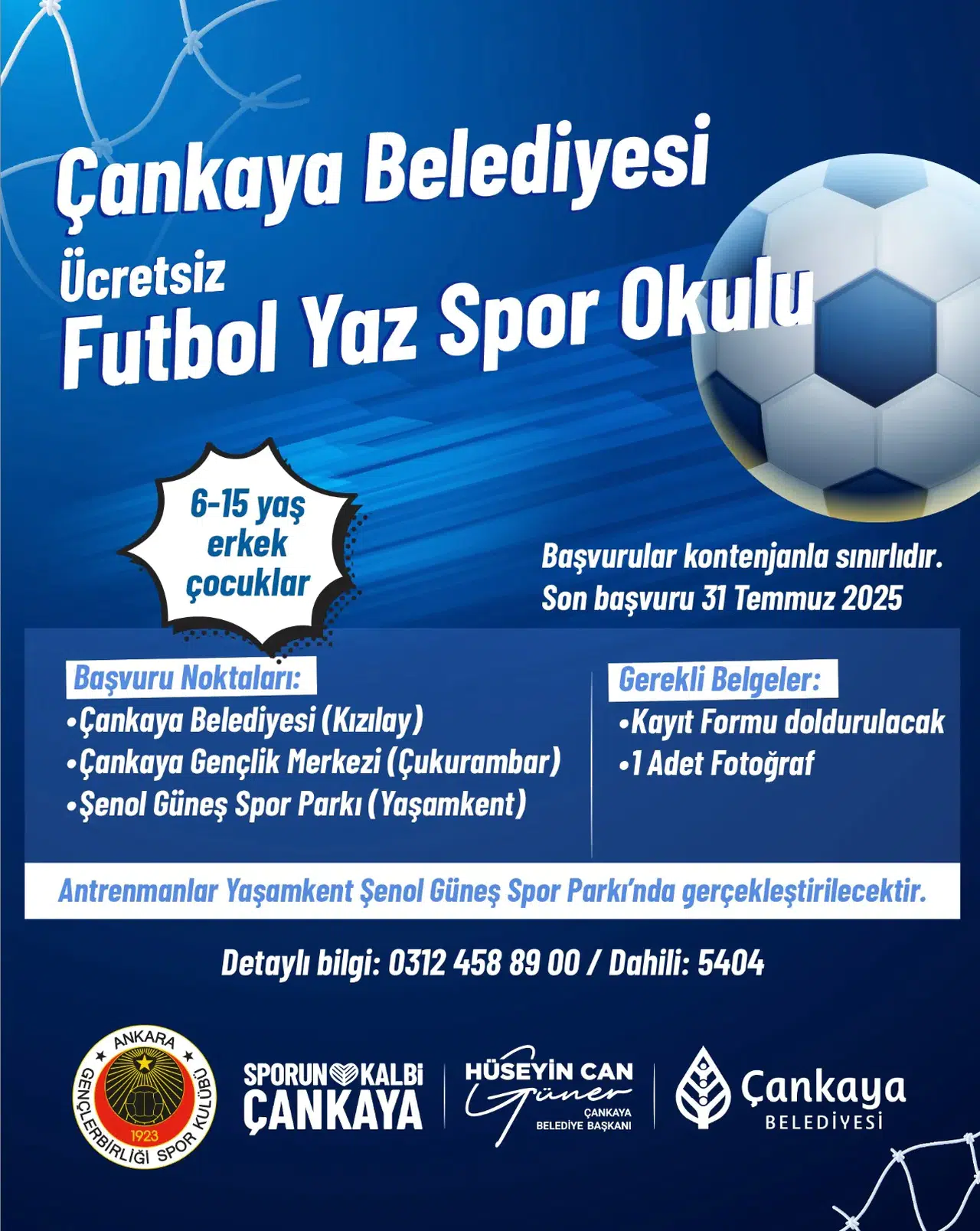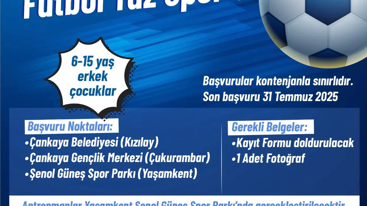 Futbol Yaz Spor Okuluna başvurular, Çankaya Belediyesi Ana Bina (Kızılay), Çankaya Gençlik Merkezi’nden (Çukurambar) ve Şenol Güneş Spor Parkı'ndan (Yaşamkent) yapılabilecek.