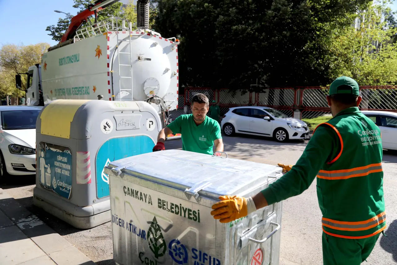 Belediye yeni çöp konteynerlerini yerleştirirken bir yandan da bölgedeki konteynerlerin bakımını yapıyor. Konteynerlerde oluşan bakteri ve kötü kokuların önlenmesi amacıyla çöp konteynerlerini yıkayarak temizliyor. Tertemiz bir Çankaya için çalışan Belediye ekipleri, program dahilinde günlük konteyner temizliği ve ilaçlama çalışması ile vatandaşların daha sağlıklı bir kent ortamında yaşamalarına olanak sağlıyor.