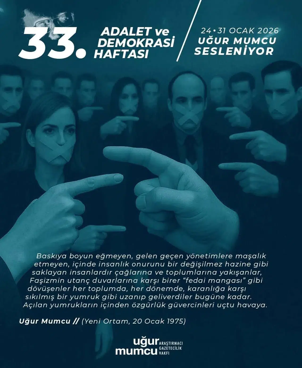 Uğur Mumcu Araştırmacı Gazetecilik Vakfı öncülüğünde, Çankaya Belediyesi'nin ev sahipliğinde gazeteci yazar Uğur Mumcu ve aydınlar anısına düzenlenen 33. Adalet ve Demokrasi Haftası, 24-31 Ocak tarihleri arasında gerçekleşecek.