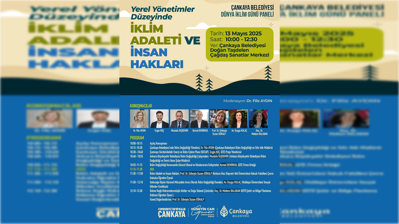 Çankaya Belediyesi 15 Mayıs Dünya İklim günü öncesinde "İklim Adaleti" için Başkent çapında önemli bir buluşmaya ev sahipliği yapıyor. Büyükşehir Belediyesi, ODTÜ ve Hacı Bayram Veli üniversitelerinin de desteğiyle 13 Mayıs'ta "İklim Adaleti ve İnsan Hakları Paneli" Çağdaş Sanatlar Merkezi'nde geniş bir katılımla gerçekleşecek.