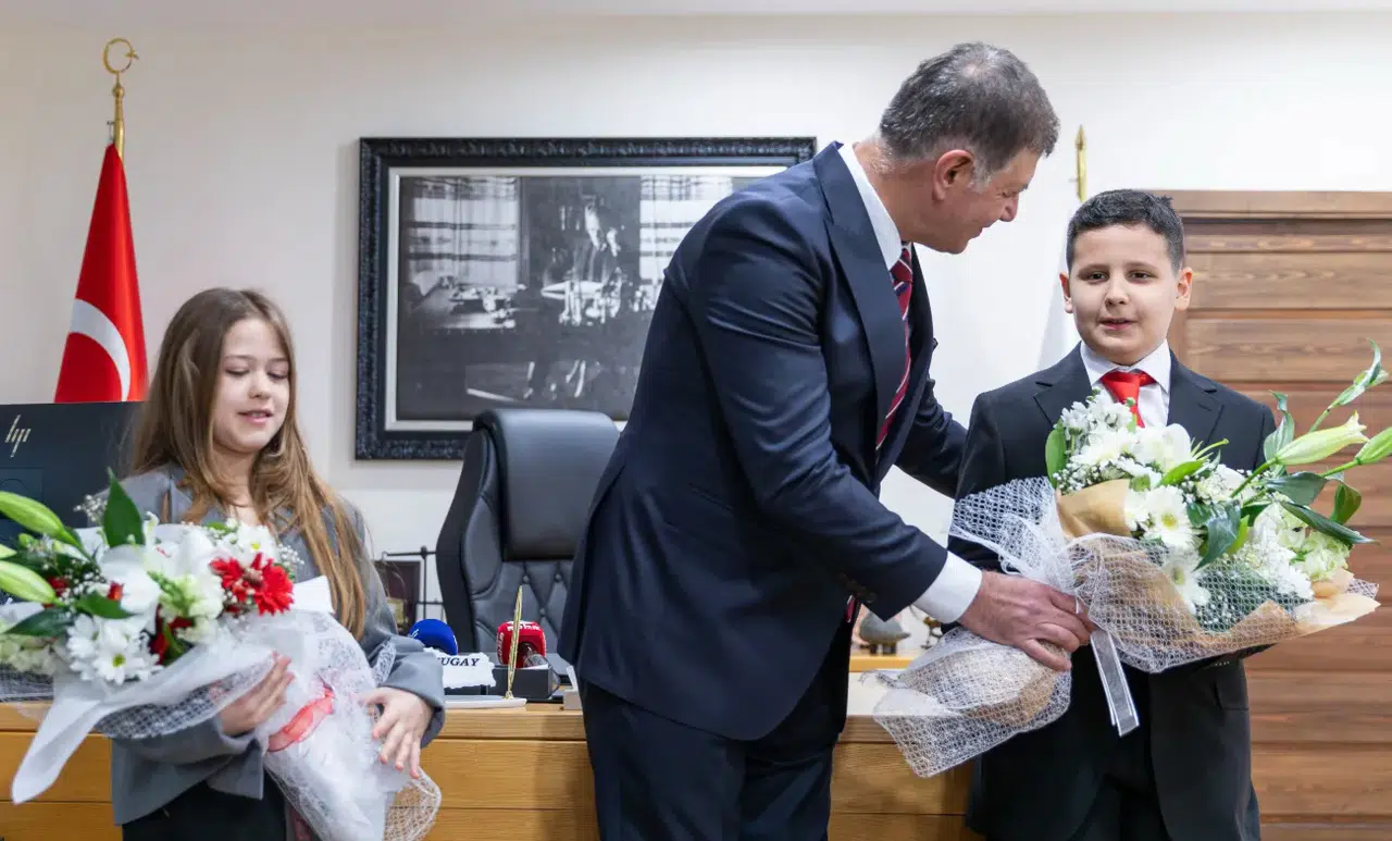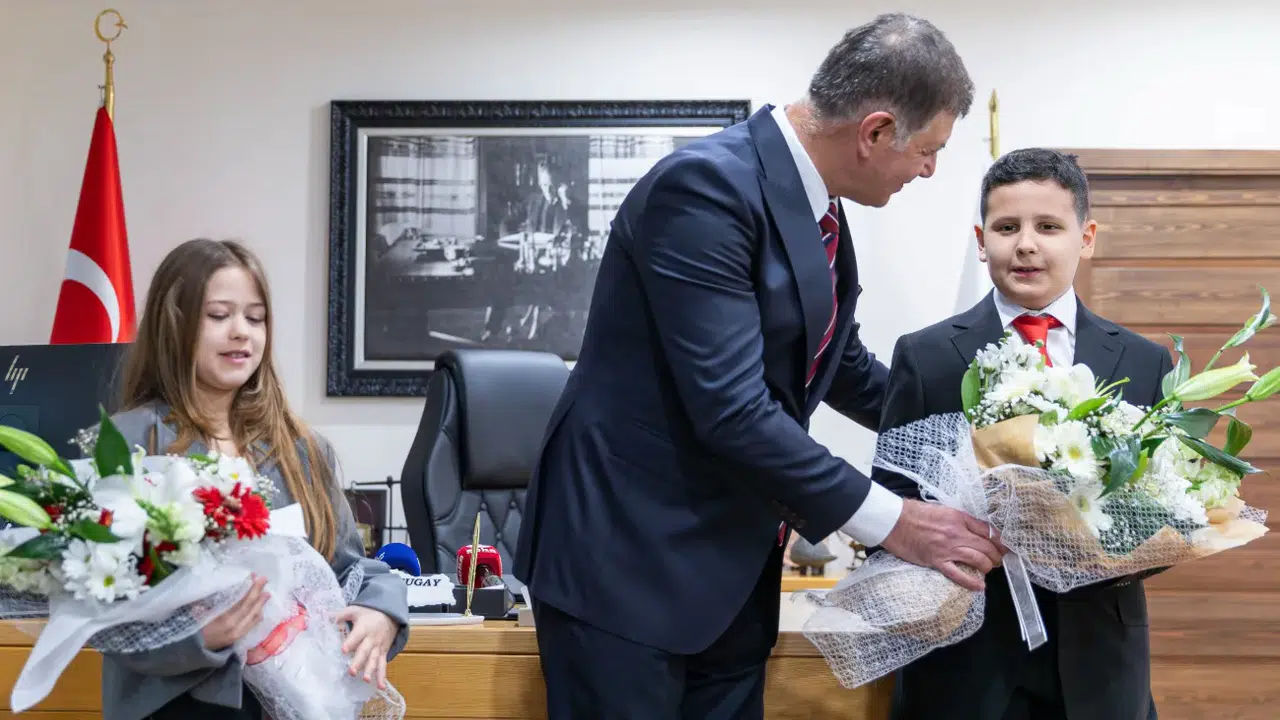 Başkan Tugay, makamında eşi Öznur Tugay ile birlikte çocukları ve ailelerini ağırladı. Samimi bir atmosferde gerçekleşen buluşmada çocukların heyecanı dikkat çekerken, verilen mesajlar da 23 Nisan’ın anlamını bir kez daha güçlü biçimde ortaya koydu. Başkan Tugay, çocukların gelecekte bu tür görevlerde yer alacağına inandığını belirterek, onların hayallerinin gerçekleşmesini diledi.