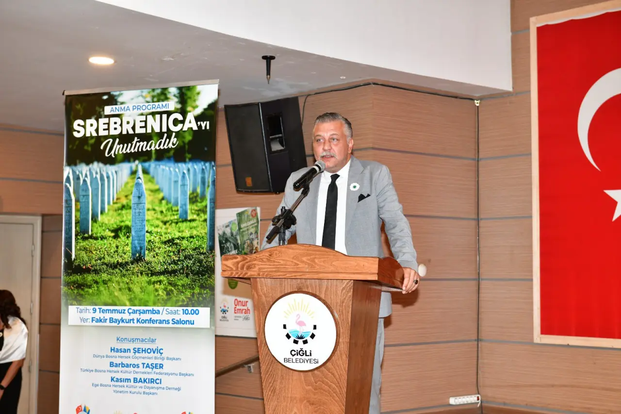 Anma etkinliğinde konuşan Çiğli Belediyesi Başkan Vekili Mustafa Bakırcı, yaşanan soykırımın derin üzüntüsünü paylaştıklarını belirtti. Bakırcı, “Bir daha hayatımızda böyle acı olayların yaşanmamasını temenni ediyorum. Srebrenica’da yaşananlar insanlık tarihine kazınmış büyük bir yara. Bugün burada, bu acıyı hep birlikte anmak ve unutmamak için bir aradayız. Aynı zamanda Dünya Bosna Hersek Göçmenleri Birliği Başkanı Sayın Hasan Şehoviç’i, Bornova Belediyesi Başkan Yardımcısı ve Türkiye Bosna Hersek Kültür Dernekleri Federasyonu Başkanı Sayın Barbaros Taşer’i ve Ege Bosna Hersek Kültür ve Dayanışma Derneği Yönetim Kurulu Başkanı Sayın Kasım Bakırcı’yı ilçemizde ağırlamaktan büyük memnuniyet duyuyoruz” dedi.