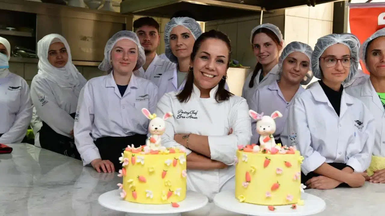 Kursiyerler, ulusal yarışmalarda altın ve gümüş madalyalar kazanmış Pastane Şefi Ebru Anar’dan da eğitim alıyor. Sektörde uzun yıllardır aktif olarak çalışan Anar, aynı zamanda işletmeci ve eğitmen kimliğiyle tanınıyor. Kendi işletmesinde üretimlerini sürdüren Anar, üniversitelerde gastronomi dersleri vererek gençlere ve kadınlara ilham olmaya devam ediyor.