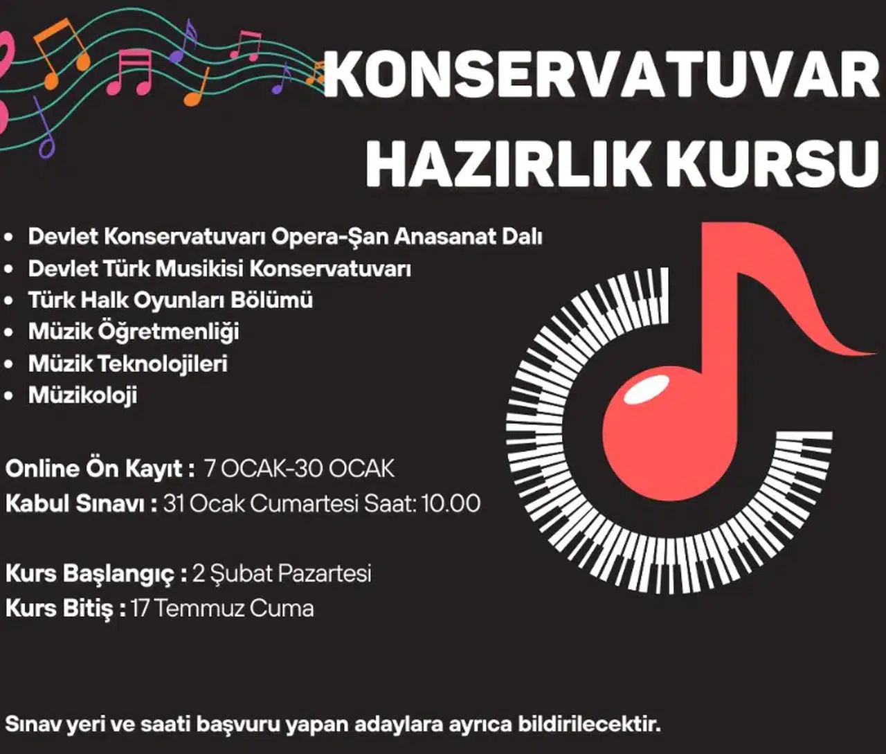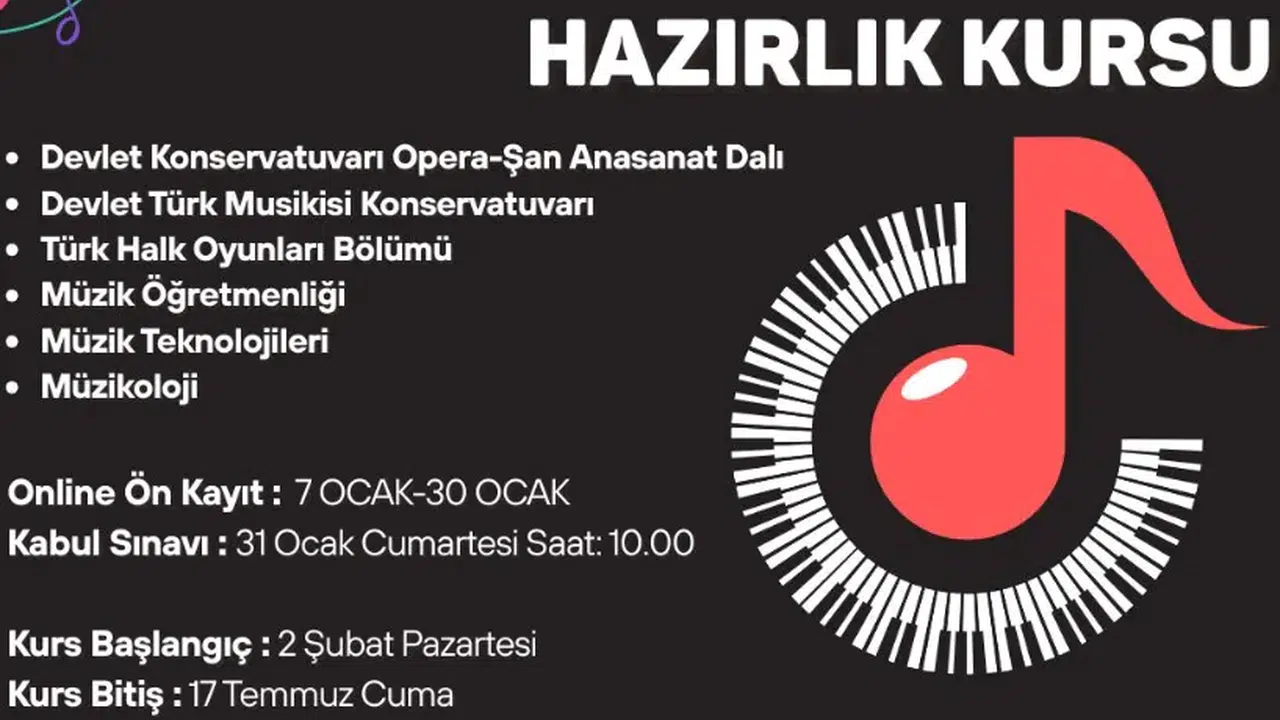 Genç İzmir Konservatuvar Hazırlık Kursu’na başvurular, 30 Ocak tarihine kadar sürecek. Başvurular, www.gencizmir.com adresi üzerinden çevrim içi olarak yapılacak. 17–25 yaş arasındaki gençlerin başvurabileceği kurs için kabul sınavı 31 Ocak’ta gerçekleştirilecek. Sınavın yeri ve saati, başvuru yapan adaylara ayrıca bildirilecek. Kurs dönemi ise 2 Şubat – 17 Temmuz 2026 tarihleri arasında gerçekleştirilecek.
