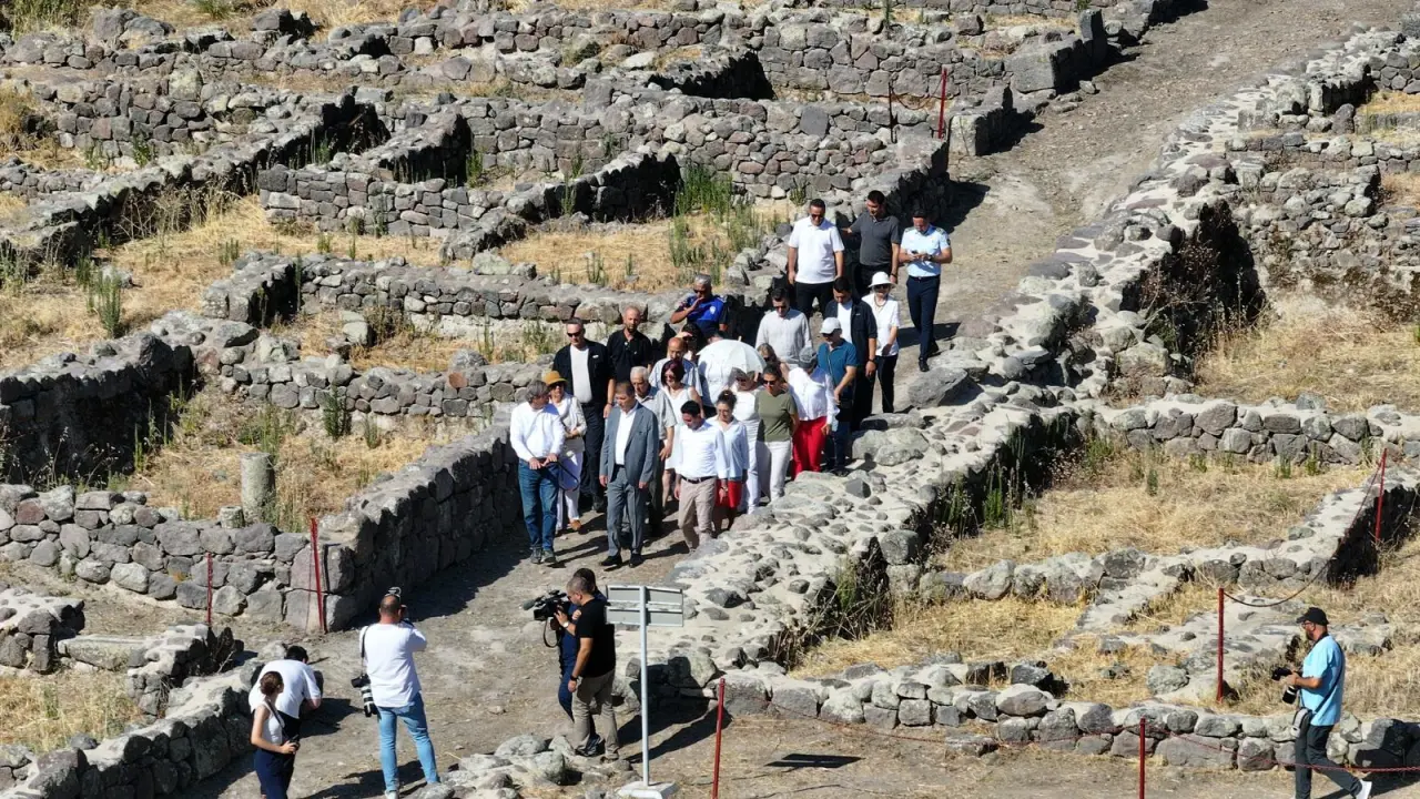 Binlerce yıllık medeniyetlerinin izlerini taşıyan örenyerini gezerek Prof. Dr. Cumhur Tanrıver’den bilgi alan Başkan Tugay, kazı çalışmalarını yerinde inceledi. Kazı ekibiyle sohbet eden Başkan Tugay, örenyerinin şartlarının geliştirilerek tarihi birikimin gün yüzüne çıkarılması için fikir alışverişinde bulundu. Başkan Tugay, sahadaki turun ardından Prof. Dr. Cumhur Tanrıver eşliğinde alandan çıkarılan tarihi eserleri inceleyerek bilgi aldı.