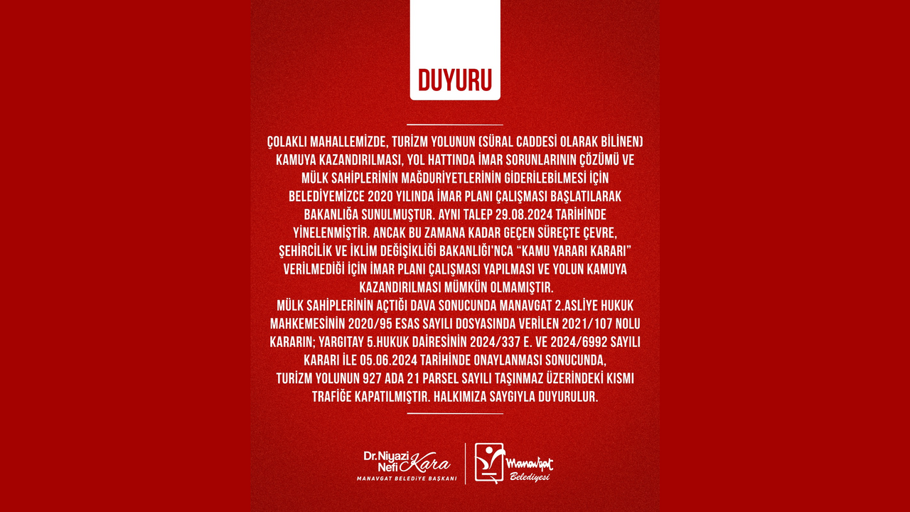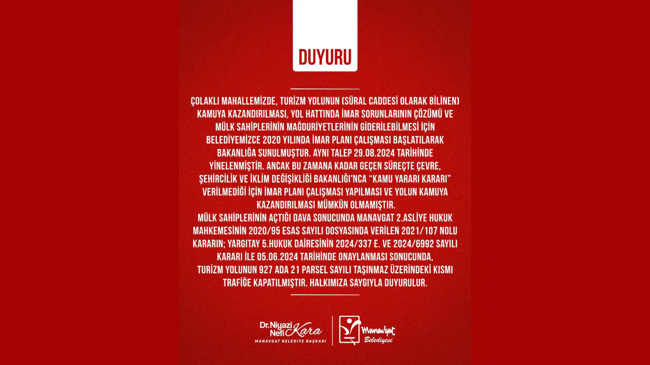 Mülk sahiplerinin açtığı dava sonucunda Manavgat 2. Asliye Hukuk Mahkemesinin 2020/95 Esas sayılı dosyasında verilen 2021/107 nolu Kararının; Yargıtay 5. Hukuk Dairesinin 2024/337 E. ve 2024/6992 sayılı Kararı ile 05.06.2024 tarihinde onaylaması sonucunda, turizm yolunun 927 ada 21 parsel sayılı taşınmaz üzerindeki kısmı trafiğe kapatılmıştır. Halkımıza saygıyla duyurulur.”