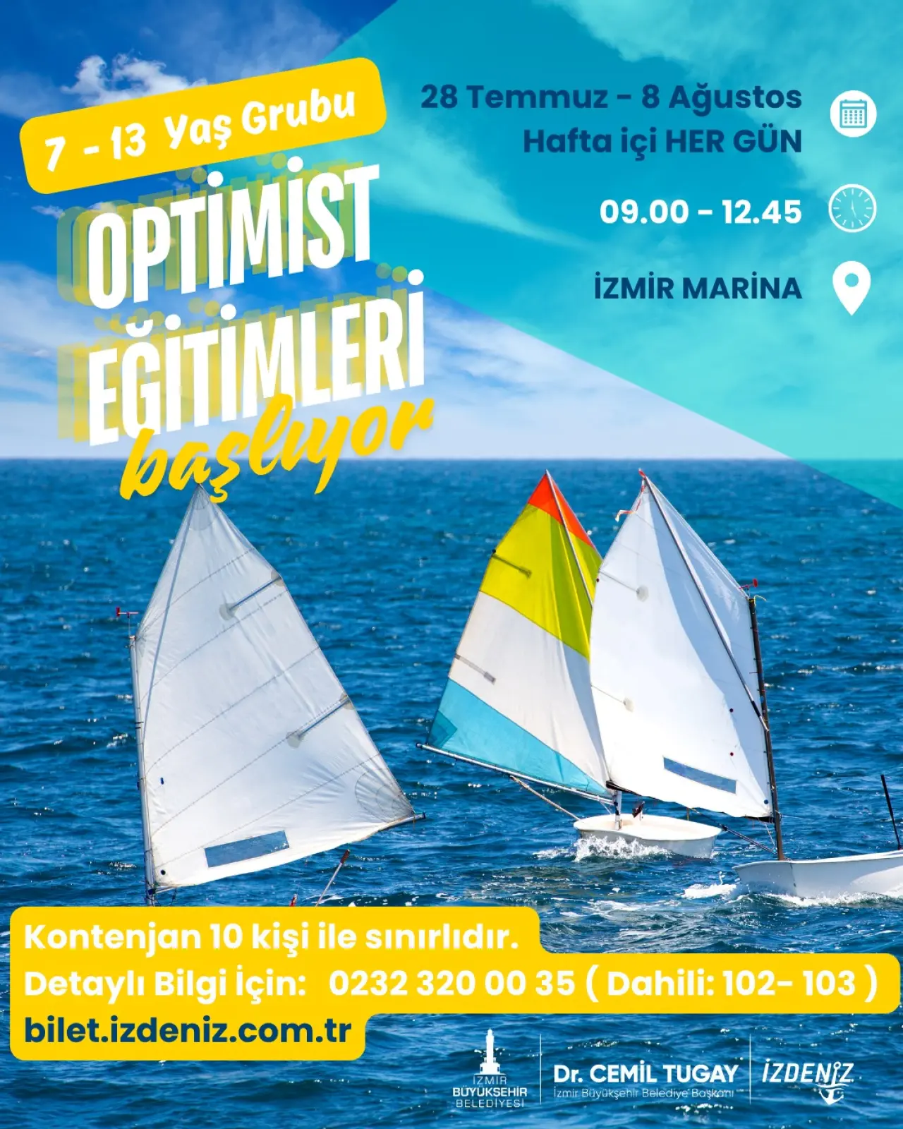 İzmir Marina'da ayrıca çocuklar için özel olarak hazırlanan Optimist eğitimleri de başlıyor. 7-13 yaş aralığındaki çocukların katılabileceği bu eğitimler, 28 Temmuz ile 8 Ağustos tarihleri arasında gerçekleştirilecek. Eğitimler, çocukların hem eğlenceli vakit geçirmesini hem de belirli bir beceri kazanmalarını hedefliyor. Kontenjan sınırlı olup, bu programda 10 katılımcıyla sınırlı kalınacak. Eğitim sonunda, katılımcılar “Türkiye Yelken Federasyonu D4 Eğitim Sertifikası” ve “Katılımcı Sertifikası” alarak başarılı bir şekilde programı tamamlayacaklar. Kayıt işlemleri [bilet.izdeniz.com.tr](http://bilet.izdeniz.com.tr) üzerinden yapılabilir ve daha fazla bilgi için 0 232 320 00 35 -102 /103 numaralı telefon aranabilir.