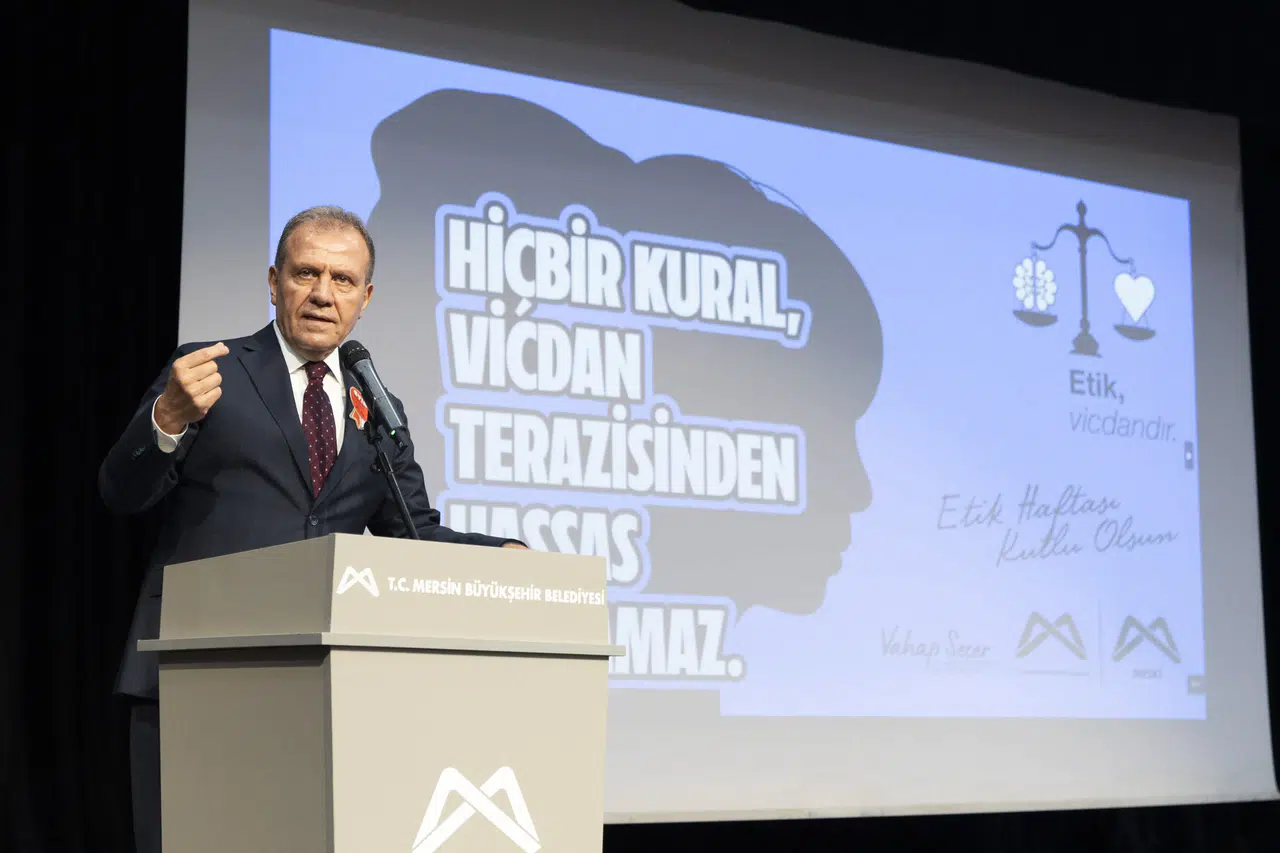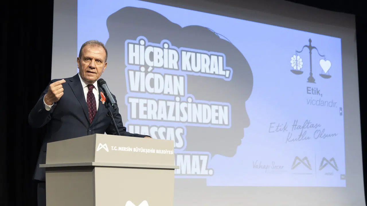 Mersin Büyükşehir Belediye Başkanı Vahap Seçer, Mersin Büyükşehir Belediyesi ve Mersin Su ve Kanalizasyon İdaresi Genel Müdürlüğü (MESKİ) tarafından düzenlenen Etik Haftası etkinliğine katıldı. Etik haftası etkinliği; ‘Etik, Vicdandır’ , ‘Hiçbir Kural, Vicdan Terazisinden Hassas Tartamaz’, ‘Etik Konuşur, Herkes Duyar’, ‘Etik Olmazsa Ekip Olmaz’ ve ‘Etik Pusulandır, Yönünü Şaşırma’ sloganları ile düzenlendi.