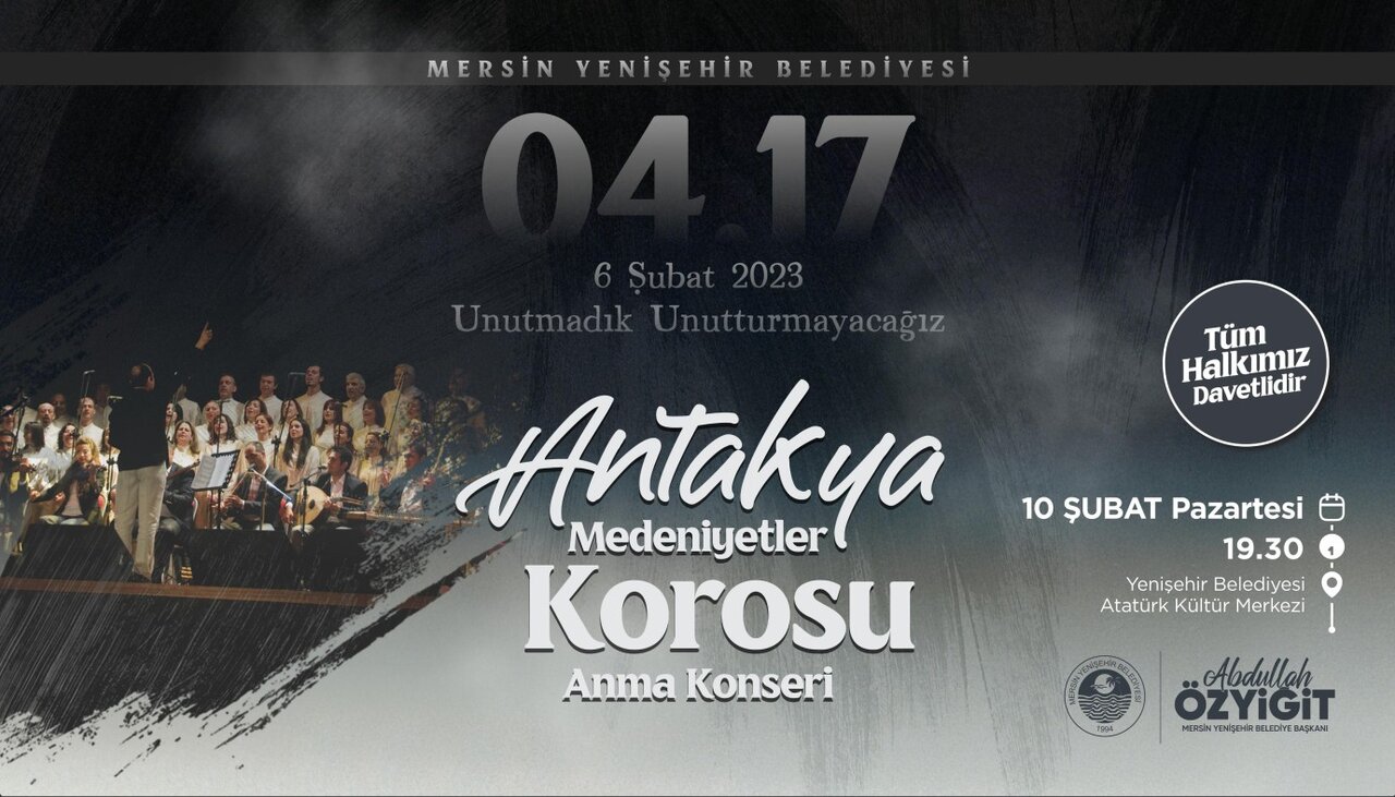 Mersinlileri anma konserine davet eden Yenişehir Belediye Başkanı Abdullah Özyiğit, “6 Şubat depremleri, hepimizin yüreğinde derin izler bıraktı. Bu felakette yitirdiklerimizi, evsiz kalanları ve hayatları değişen tüm vatandaşlarımızı asla unutmayacağız. Antakya Medeniyetler Korosu ile hayatını kaybeden vatandaşlarımızı anmak, acılarımızı paylaşmak ve dayanışma ruhunu daima canlı tutmak adına düzenleyeceğimiz anma konserine vatandaşlarımızı bekliyoruz.” ifadelerini kullandı.
