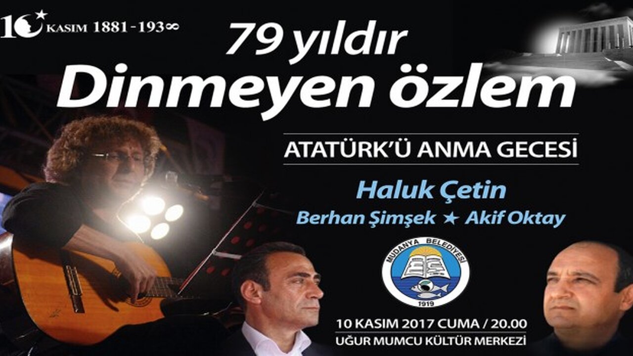 Barışın ve Kardeşliğin Başkenti Mudanya Belediyesi, 79 yıl önce ebediyete uğurladığımız Ulu Önder Mustafa Kemal Atatürk’ü 10 Kasım’da özel bir konserle anacak. Atatürk’ü Anma Gecesi, Haluk Çetin'in müzikleri, Akif Oktay'ın şiirleri ve Berhan Şimşek'in sohbeti ile 10 Kasım Cuma saat 20.00’de Uğur Mumcu Kültür Merkezi’nde yapılacak. Atatürk’ü Anma özel etkinliğinde Atatürk’ün sevdiği şarkılar da seslendirilecek. Mudanya Belediye Başkanı Hayri Türkyılmaz, tüm Bursalıları 10 Kasım günü, Ulu Önder Atatürk’ün emanet bıraktığı Türkiye Cumhuriyeti’nin mühürlerinden biri olan Mütareke kentine, Mudanya’ya davet etti.